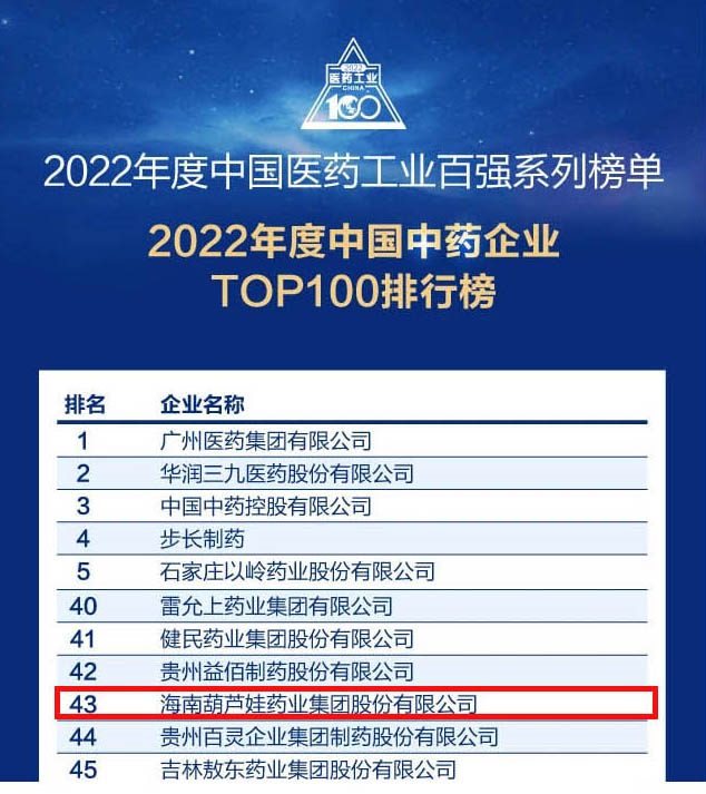 会议期间,一年一度的中国医药工业百强系列榜单隆重揭晓,70net永乐高药业集团凭借领先的研发优势和扎实的生产实力以及稳健的市场推广能力,连续第四年成功入选“2022年度中国中药企业TOP100排行榜” ,排名稳步上升至第43位。